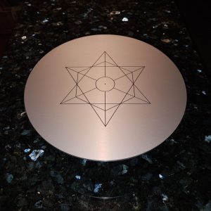 Auf der Oberseite der Platte haben wir unser bildrechtlich geschütztes Symbol®: “Punkt mit Kreis“ im Hexagramm eingelasert. Der Punkt mit Kreis, auch Sonnenzeichen genannt, steht als Symbol für das Göttliche und für die Seelenkraft. Schon Pythagoras bezeichnete den Kreis als die vollkommenste Form, die alles enthält und aus der alles hervorgeht. Der Kreis hat weder Anfang noch Ende und ist somit endlos und symbolisiert somit auch die Ewigkeit. Der Kreis ist somit das Ursymbol schlechthin, so auch der Punkt der ein kleiner ausgefüllter Kreis ist. Das Sonnenzeichen spiegelt uns das Gesetz der Reflexion und der Selbsterkenntnis. Vertraue Dir und Deinem Bauchgefühl vollkommen, Deiner Mitte, Deinem Punkt in Deiner Körpermitte. Sei Dir und Deinen Visionen treu und lass Dich nicht vom Außen davon abbringen. Erkenne Deine Kraft und Dein Licht, entfalte Dich aus deiner Mitte heraus nach außen und lass Dein Licht leuchten.